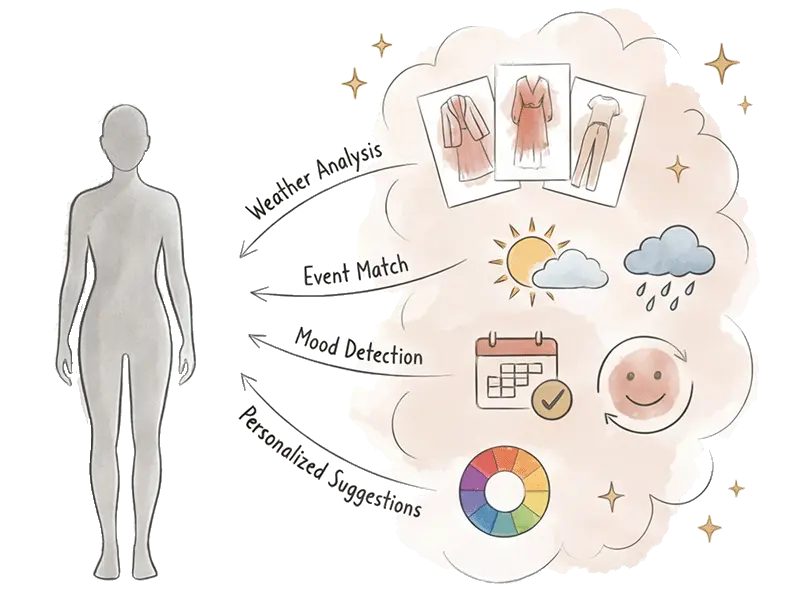 AI analyzes your wardrobe, color type, and preferences to create perfect outfits for every day and any occasion.